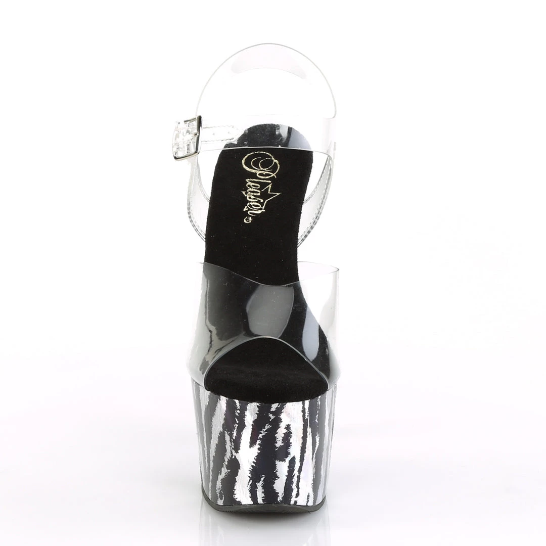 7″” (178mm) Heel, 2 3/4″” (70mm) Platform Ankle Strap Sandal w/ Holographic Zebra Print on the Platform Bottom