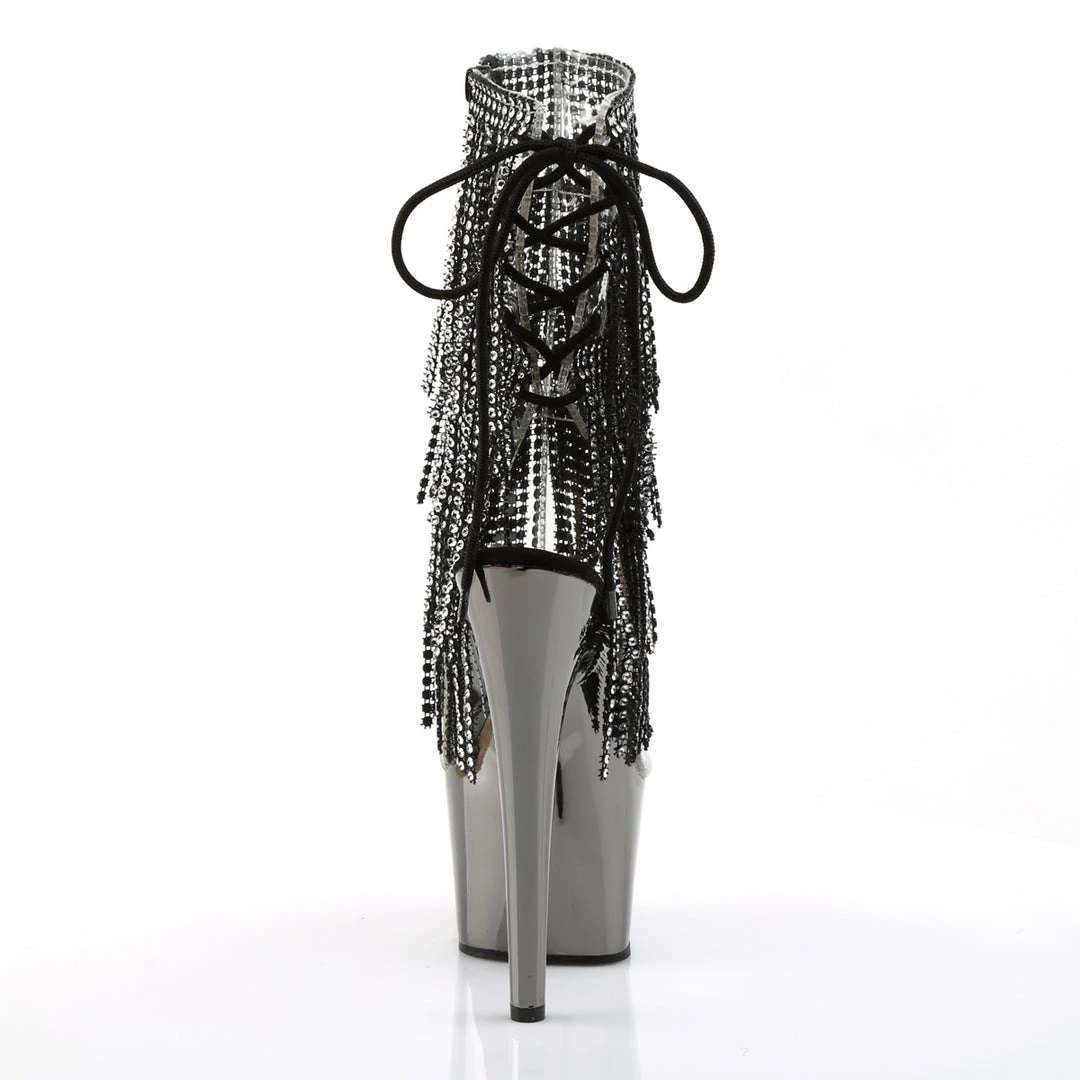 Say hello to these stunning dark rhinestoned 7 inch platform pole dancing ankle boots by Pleaser. This sexy style features a platform bottom, an open toe, stiletto heel, lace up ankle boot. simulated rhinestone fringe and inside zip closure.
