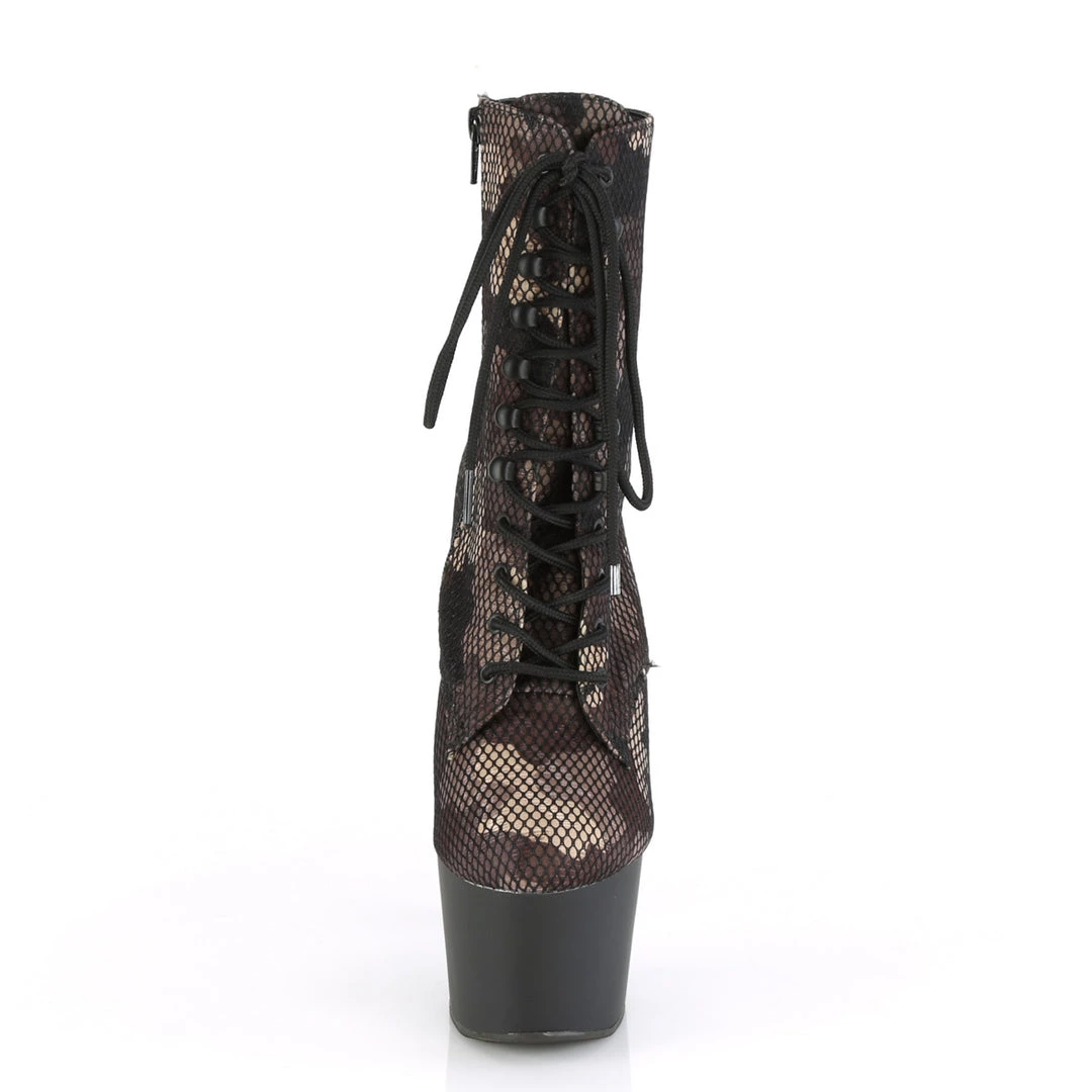 March to the beat in these fierce Adore 1020CM ankle boots from Pleaser. These sexy high heels come in a camo print mesh fabric, a stand out feature on a classic style.Â