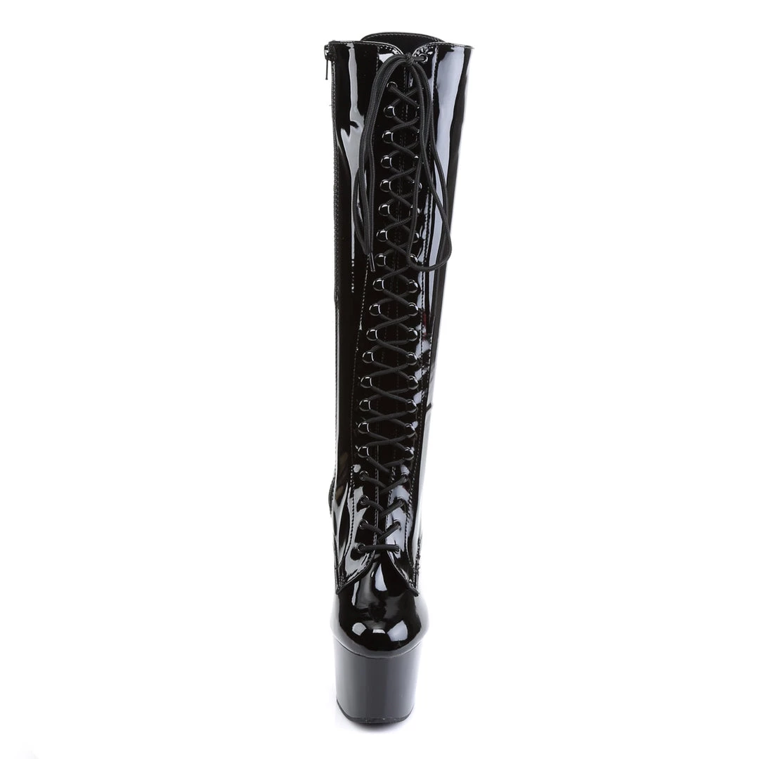 7″ (17.8cm) Stiletto Heel, 2 3/4″ (7cm) Platform Lace-Up Stretch Knee Boot, Full Inner Side Zipper.