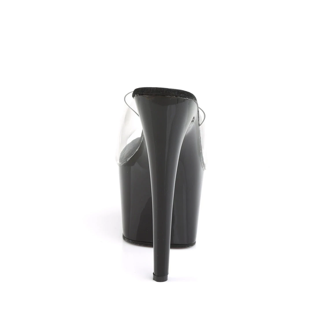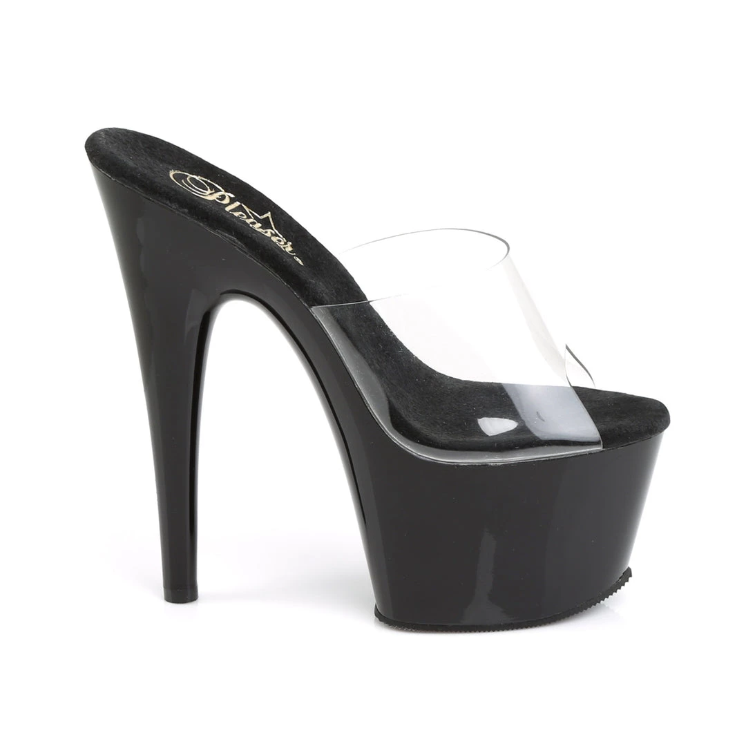 Chic black patent and clear seven inch pole dancing platform by Pleaser. These cute and classic simple sandals are the perfect addition to any poler’s collection.