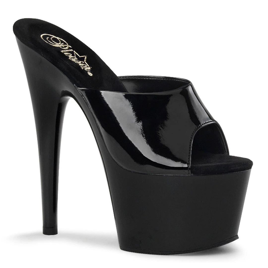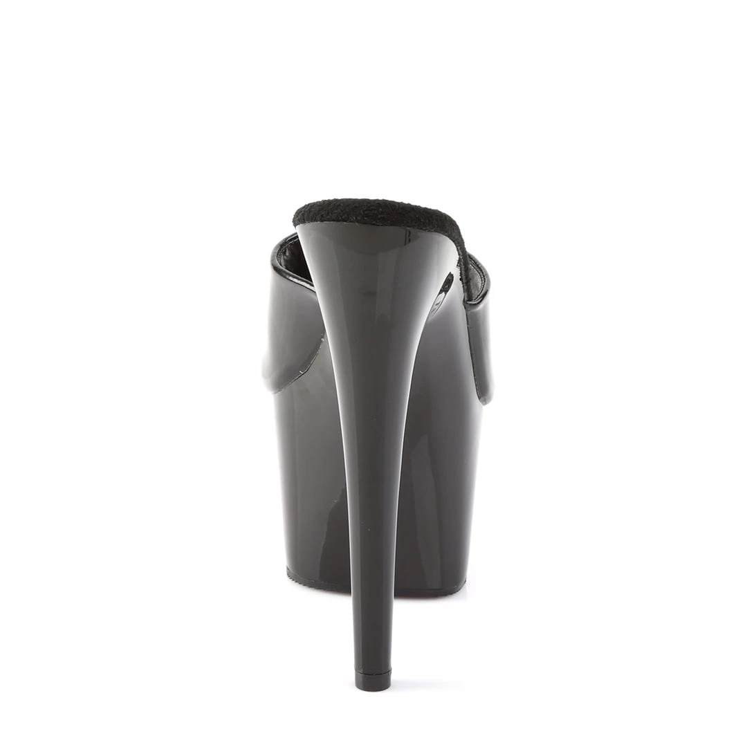 Chic black patent seven inch pole dancing platform by Pleaser. These cute and classic simple sandals are the perfect addition to any poler’s collection.