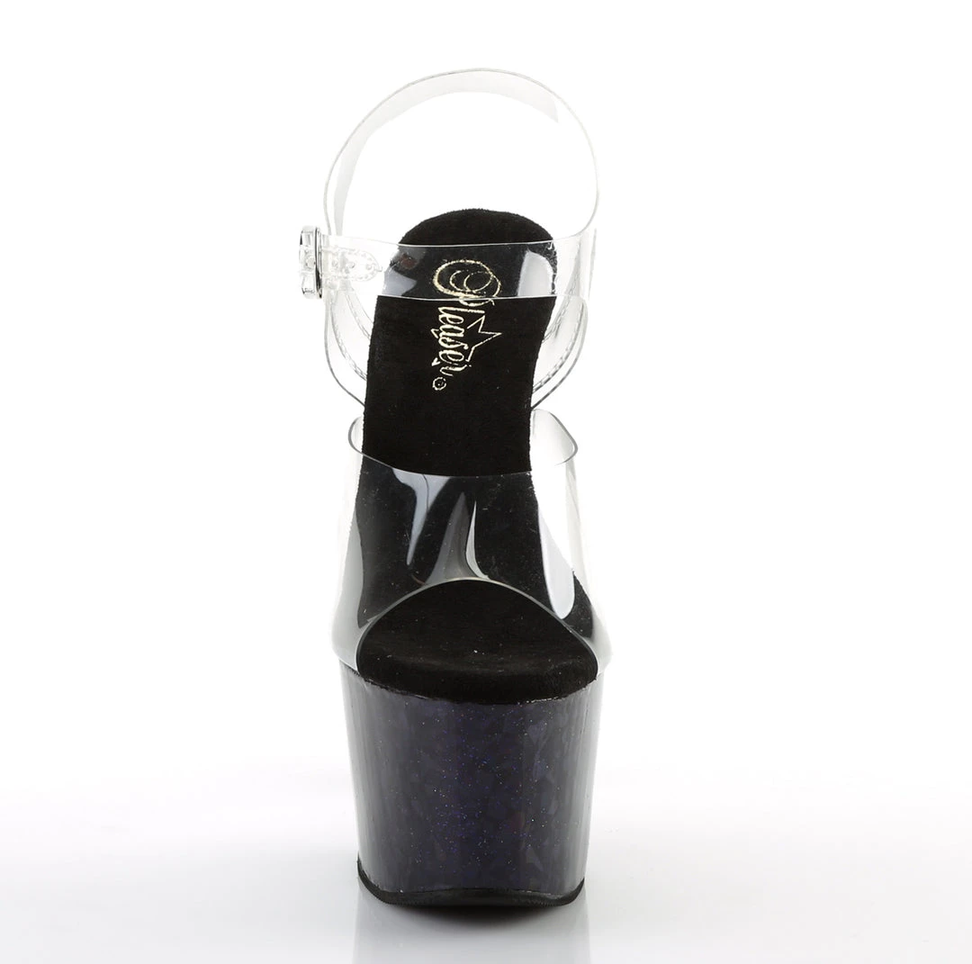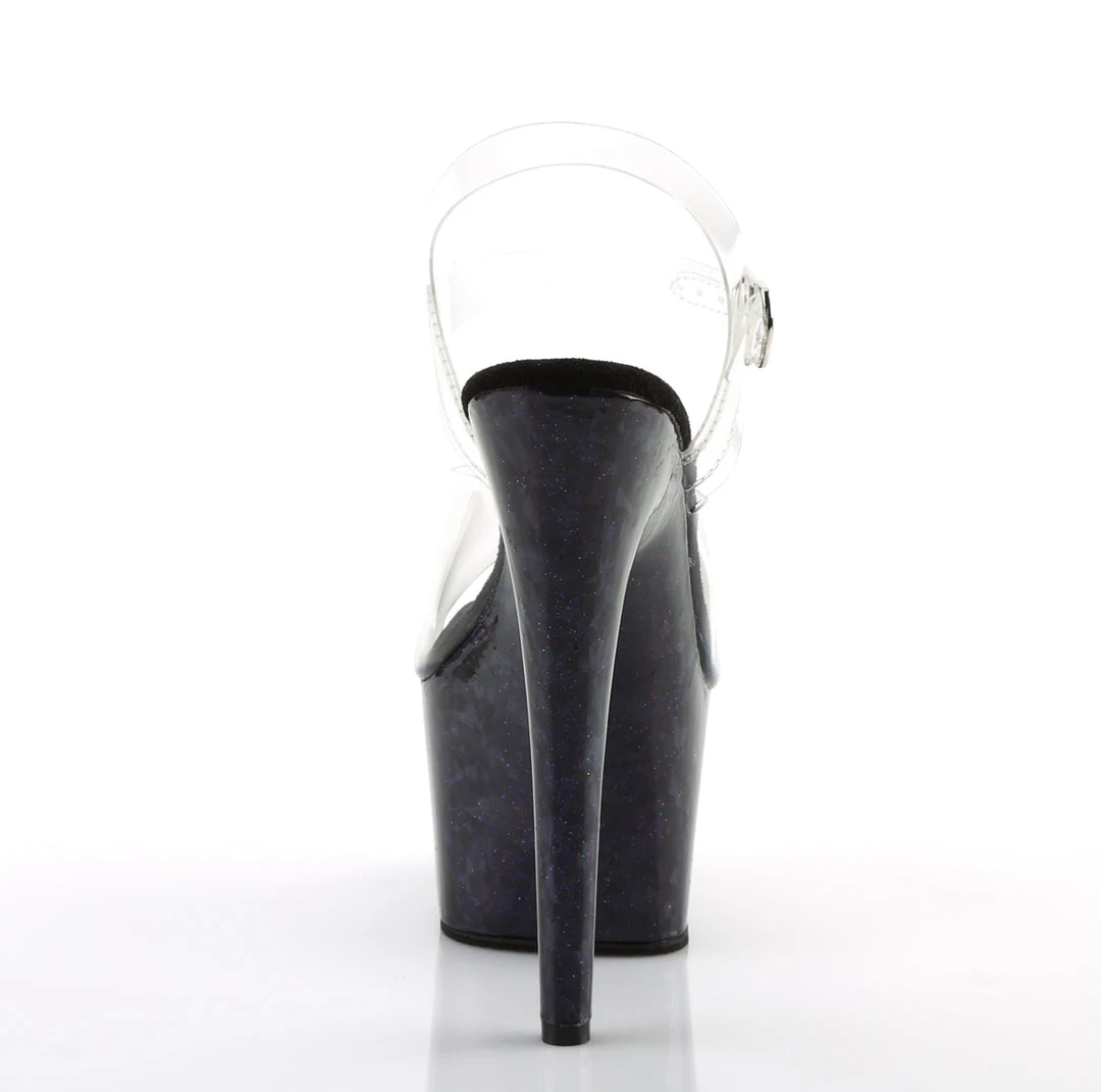 These gorgeous seven inch platforms feature a multi colour shatter print in the base. With a buckle strap for extra foot support and a sexy peep toe, these sexy high heels are a must have for any poler’s wardrobe!Â