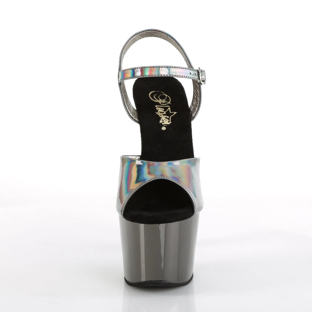 Stand out from the crowd in these gorgeous seven inch holographic and chrome pole dancing platforms. These sexy high heels come with a flattering peep toe and ankle strap, a classic design from Pleaser.Â