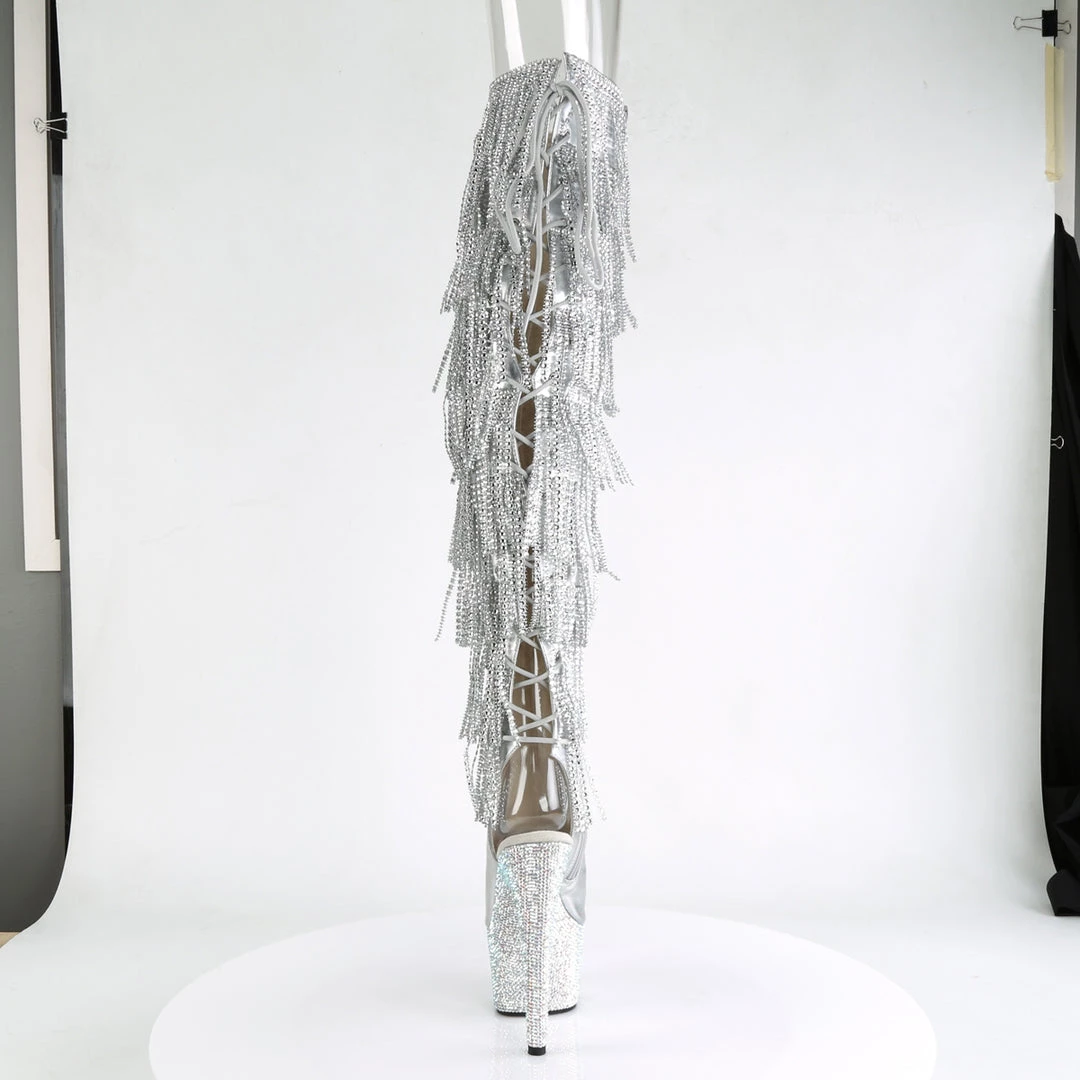 7 (17.8cm) Heel, 2 3/4 (7cm) Platform Open Toe/Heel Back Lace-Up Thigh High Boot Featuring 8-Layer Chrome Plated, Simulated Rhinestone Fringe and Rhinestones Encrusted Entire Platform, Inside Zip Closure