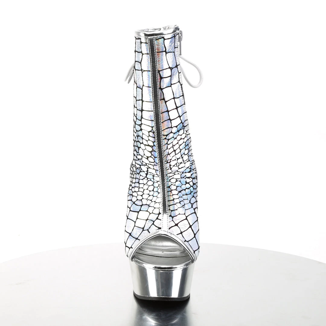 Dazzle them in these amazing holographic faux ostrich skin six inch pole dancing platform boots with peep toe. These boots feature a stiletto heel, a reflective chrome plated platform, lace up back and hidden inside zip closure.