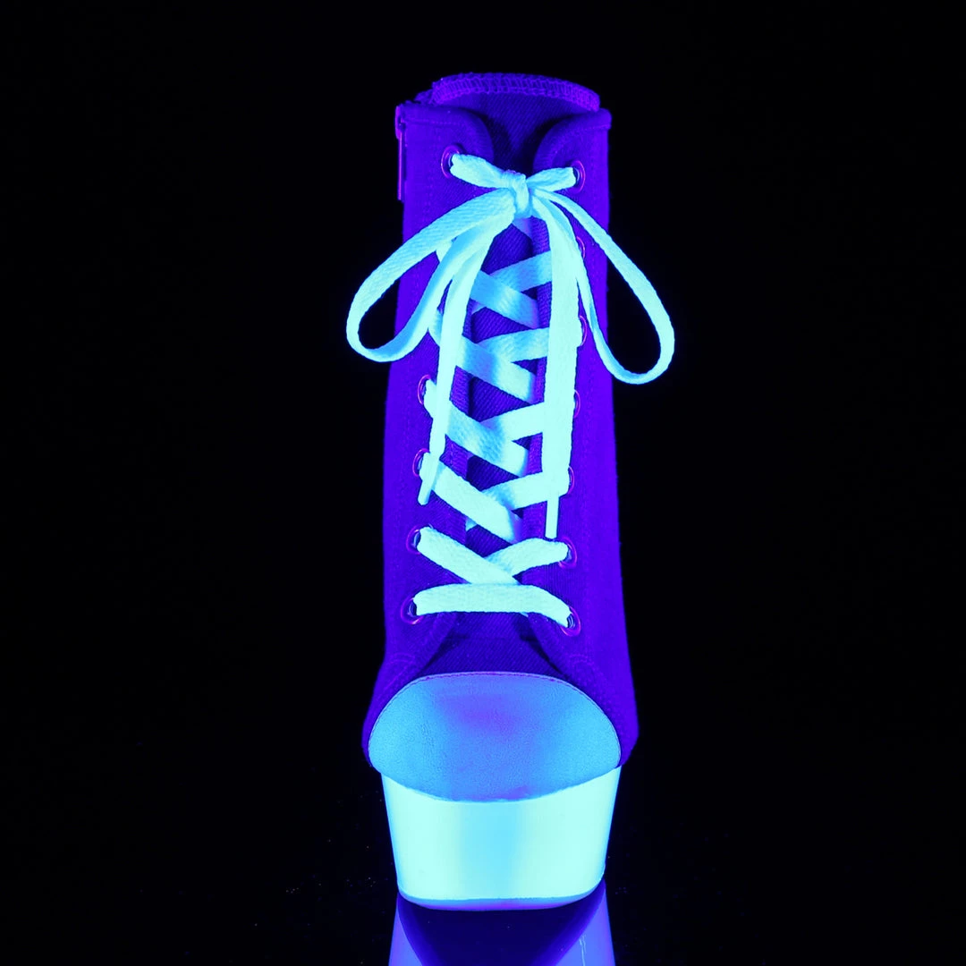 Six inch sneaker style pole dancing platforms by Pleaser. This cute and fun style features a lace up front and a UV blacklight reactive platform bottom allowing you to stand out, even in the dark.