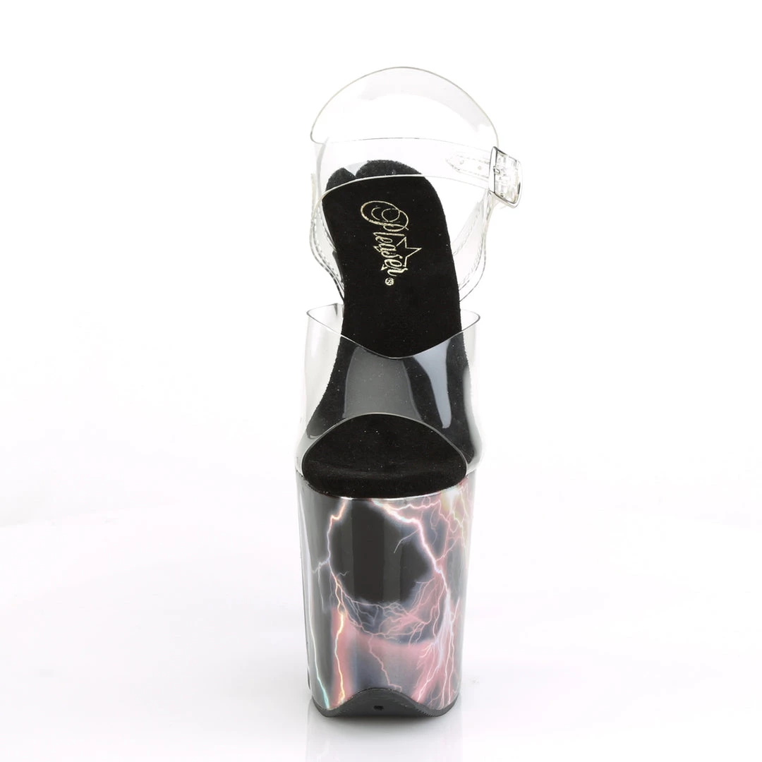 A storm is brewing in these super sexy eight inch high heels! These gorgeous pole dancing platforms feature an electrifying design with an epic holographic lightning bolt print wrapped around the entire platform. These skyscrapers also feature a flattering and comfortable clear toe and ankle strap with adjustable buckle.