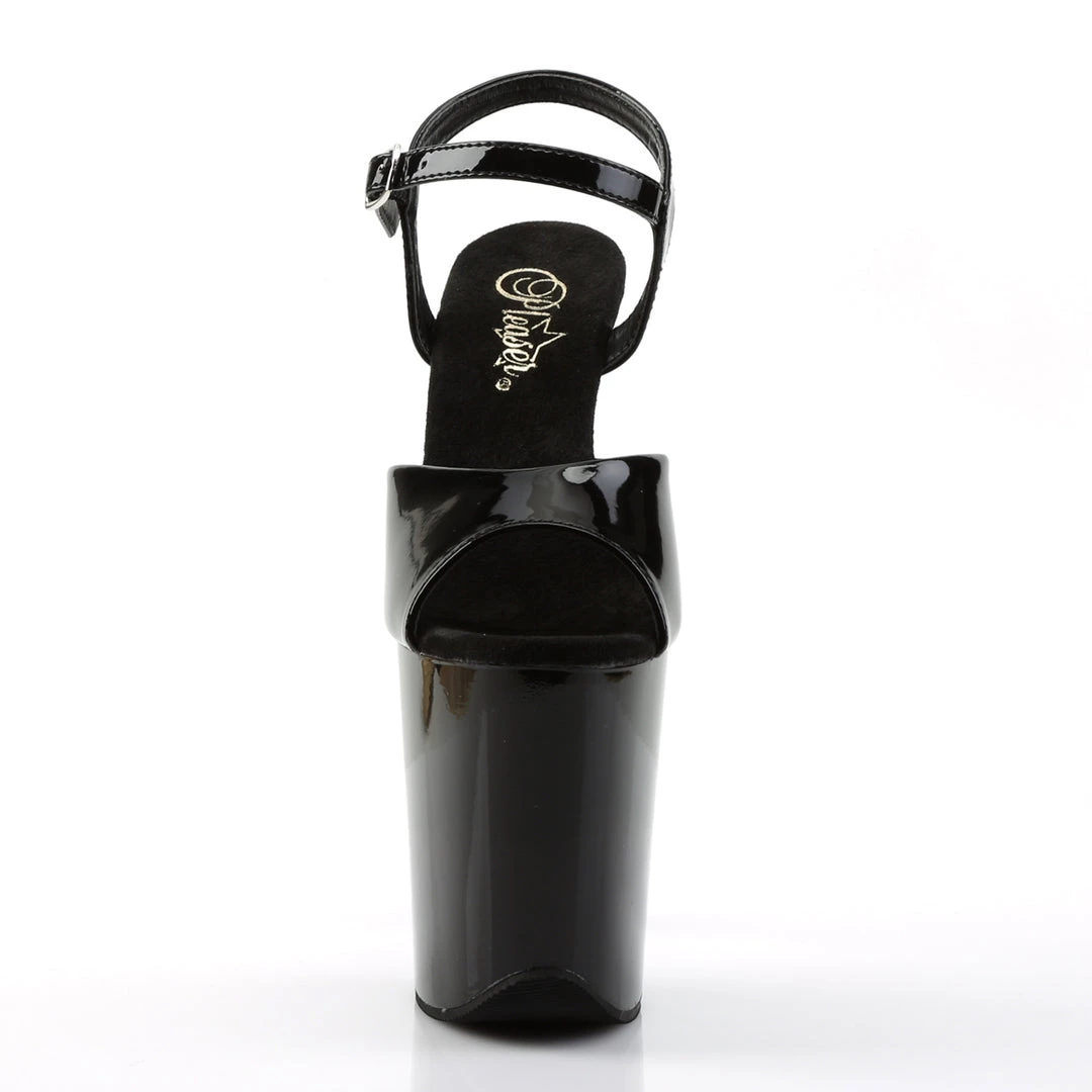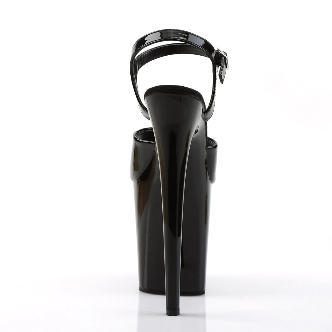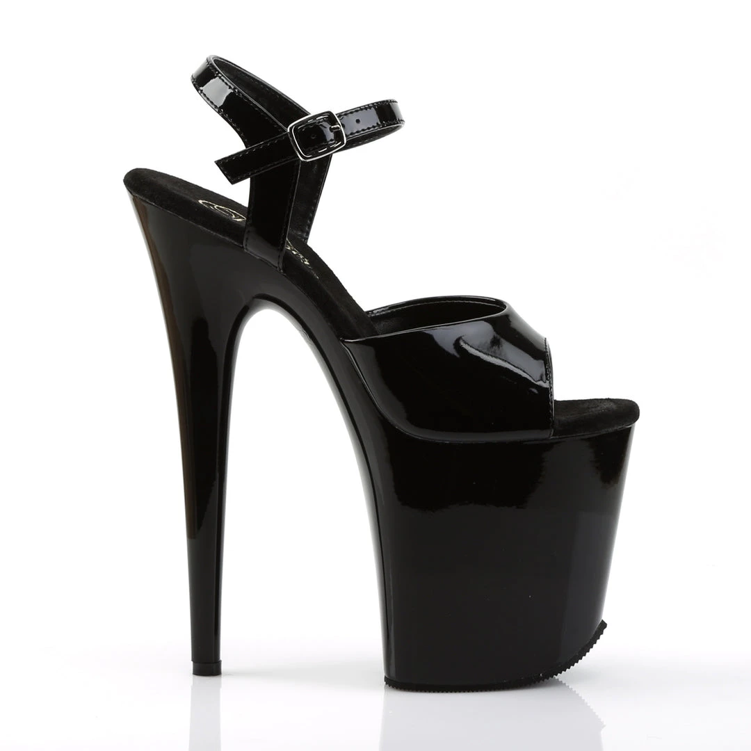 Black patent fetish sandals with top wide strap and thin side straps supporting a delicate ankle strap with side closure. The dramatic 8 inch (20 cm) high heels are the centre of attention in these super sexy sandals, while the front platform completes the look and adds further stability and comfort for the feet.Â