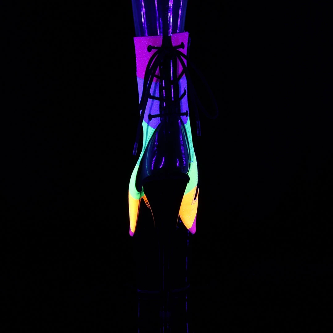Say hello to these colourful seven inch pole dancing rainbow platform peep toe ankle boots by Pleaser. These glittery boots lace-up at the back and have a blacklight reactive glow in the dark effect. Full inside zip closure.