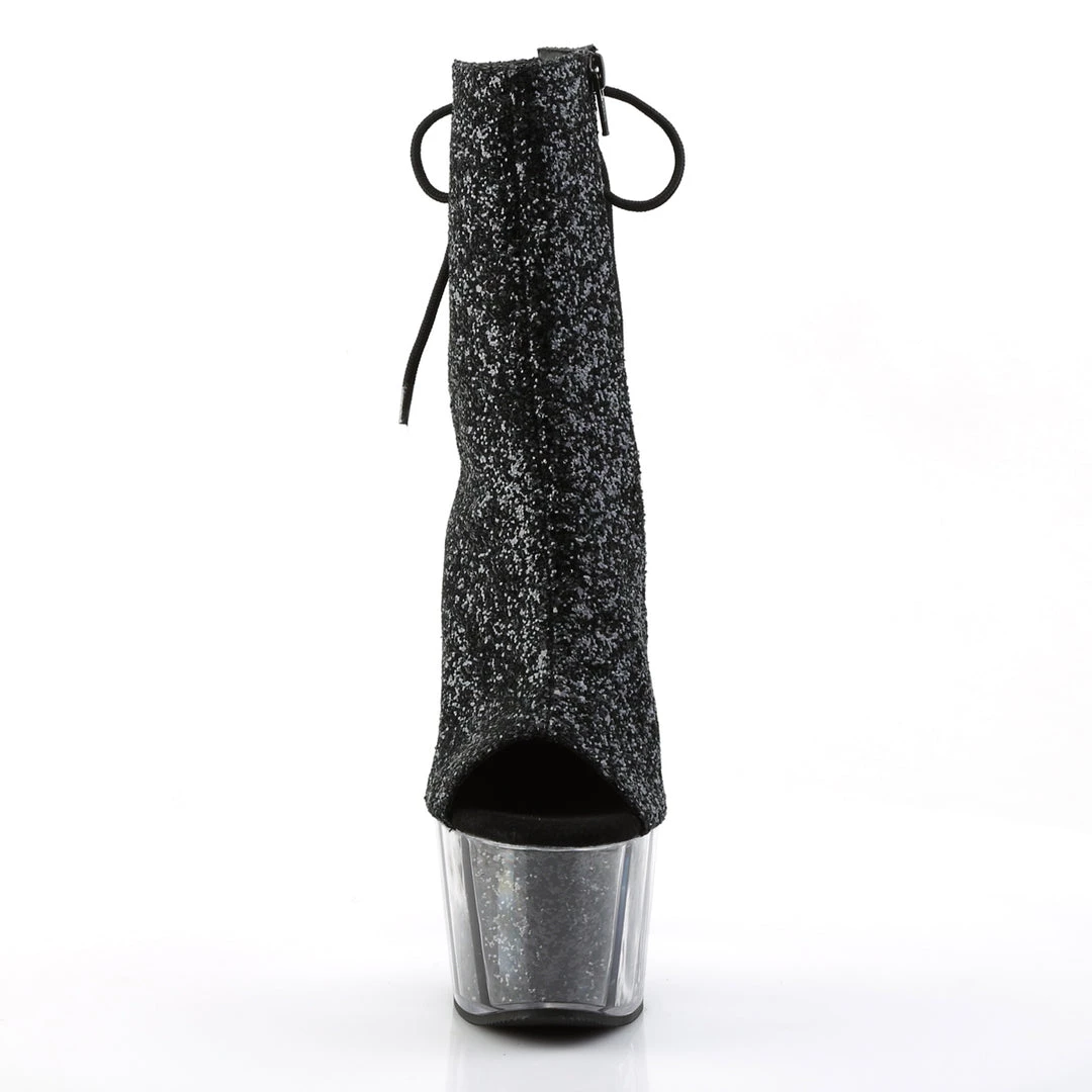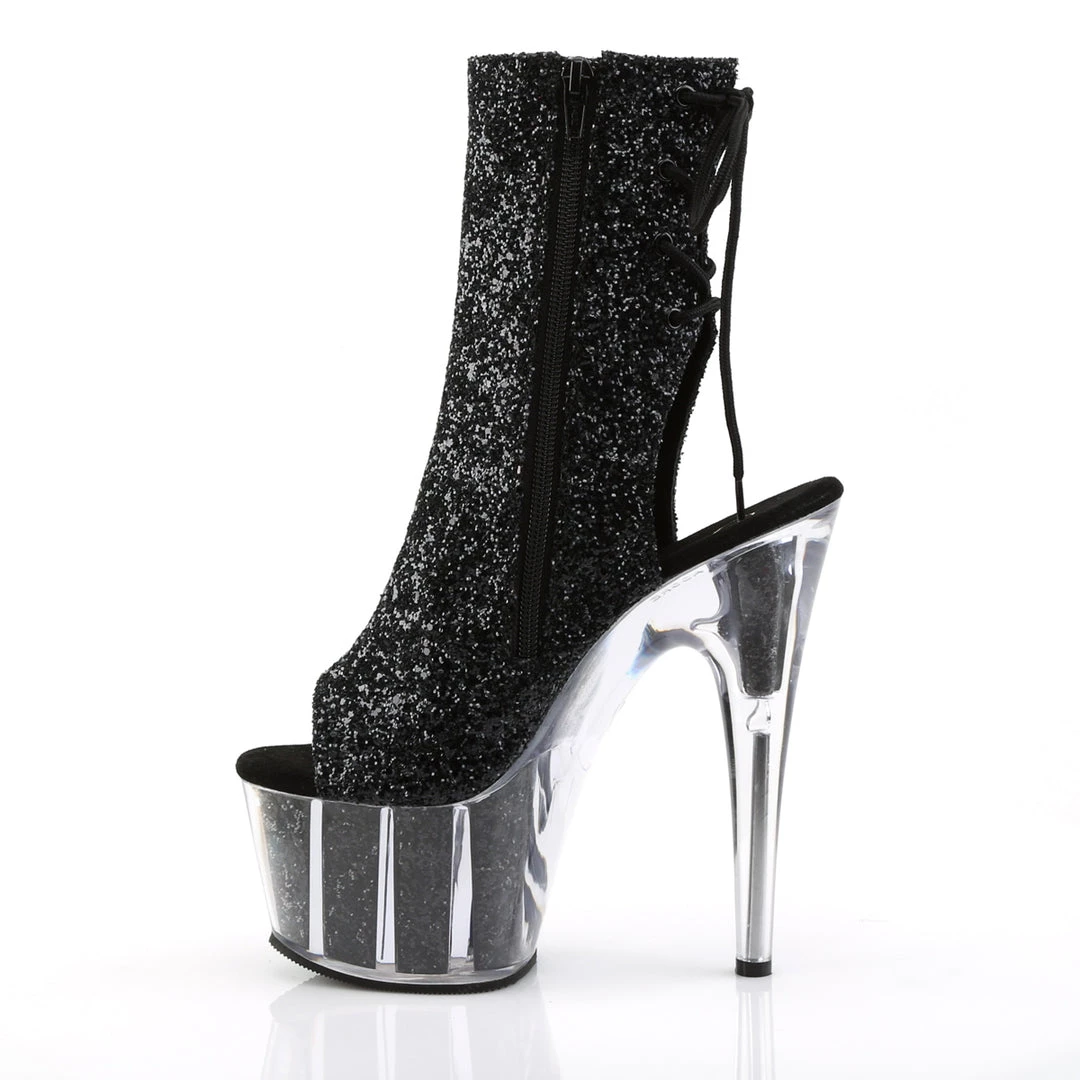 Shine bright like a diamond in these super sparkly seven inch platform pole dancing ankle boots. This gorgeous new style features a glitter inserted platform with open toe, lace-up heel and a hidden inside zip closure.
