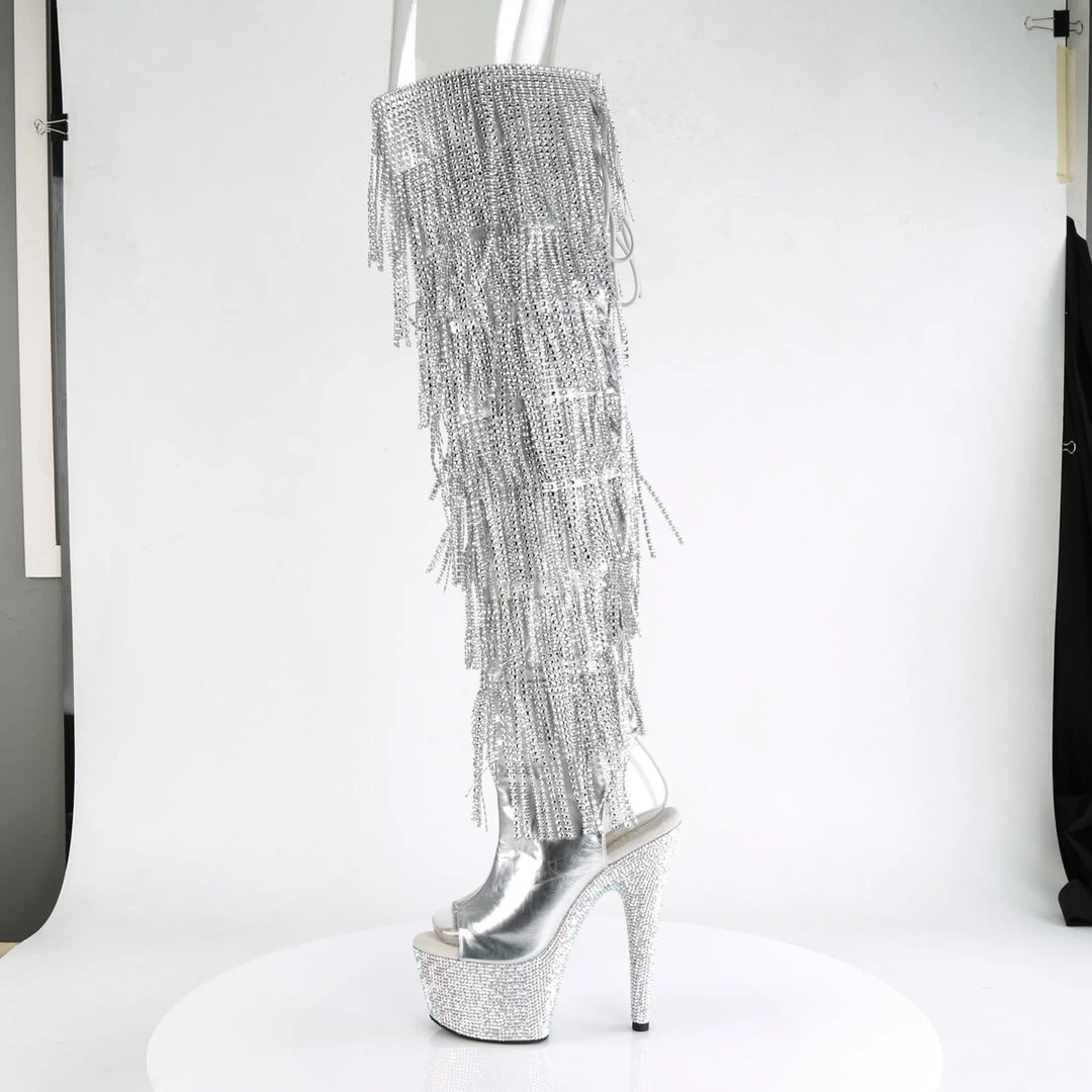 7 (17.8cm) Heel, 2 3/4 (7cm) Platform Open Toe/Heel Back Lace-Up Thigh High Boot Featuring 8-Layer Chrome Plated, Simulated Rhinestone Fringe and Rhinestones Encrusted Entire Platform, Inside Zip Closure