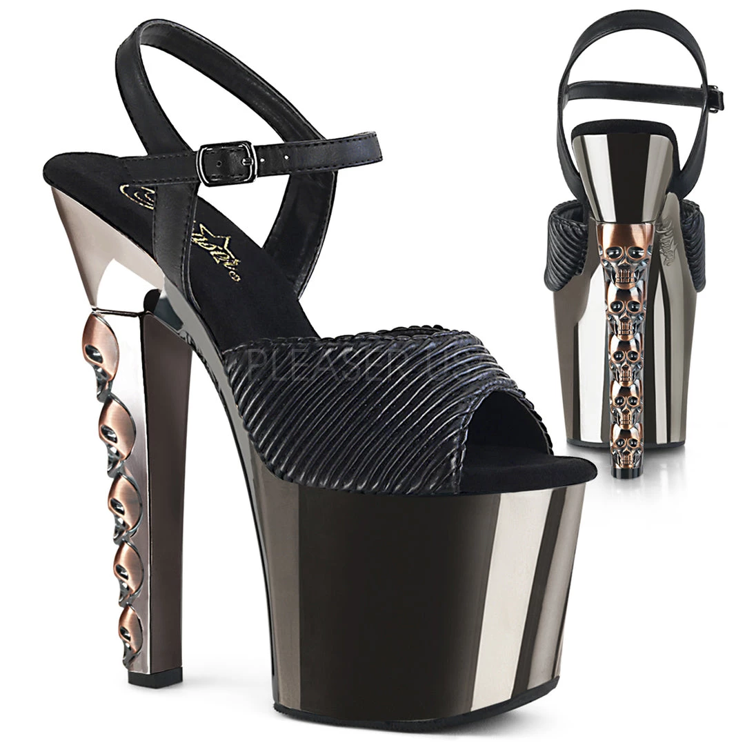 7 (178mm) Heel, 3 1/4 (83mm) Platform Ankle Strap Sandal w/ Five Skulls Stacked Heel