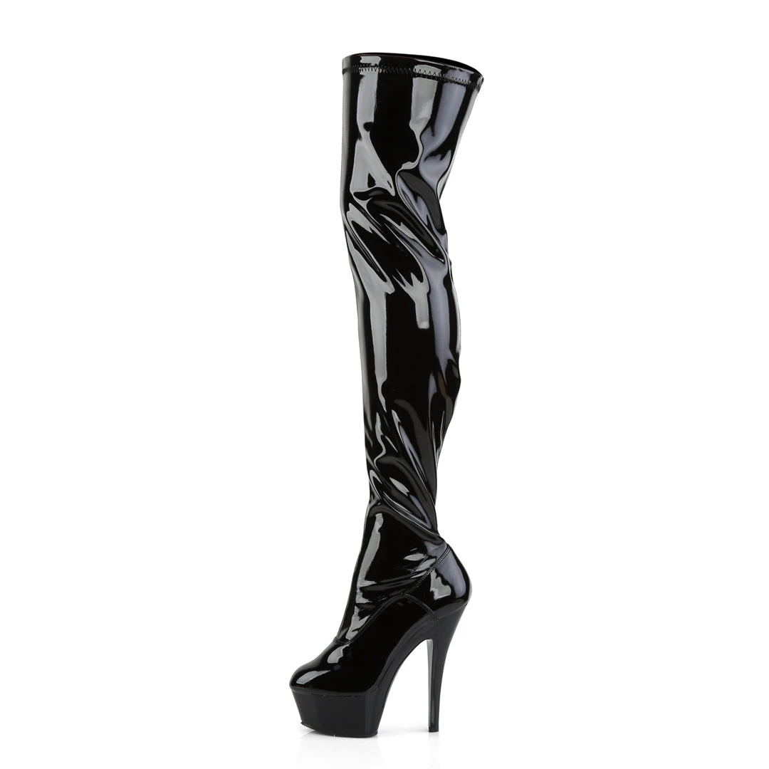 Thigh-high black patent boots with stretch design, asymmetric cut on the top and full size zipper conveniently placed on the interior side. The 6 inch (15 cm) stiletto heels are balanced by a front black platform for added stability and comfort.