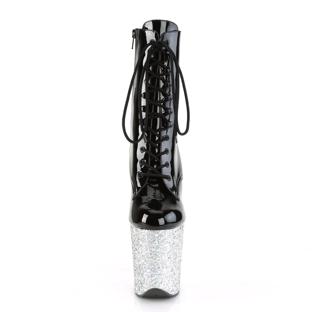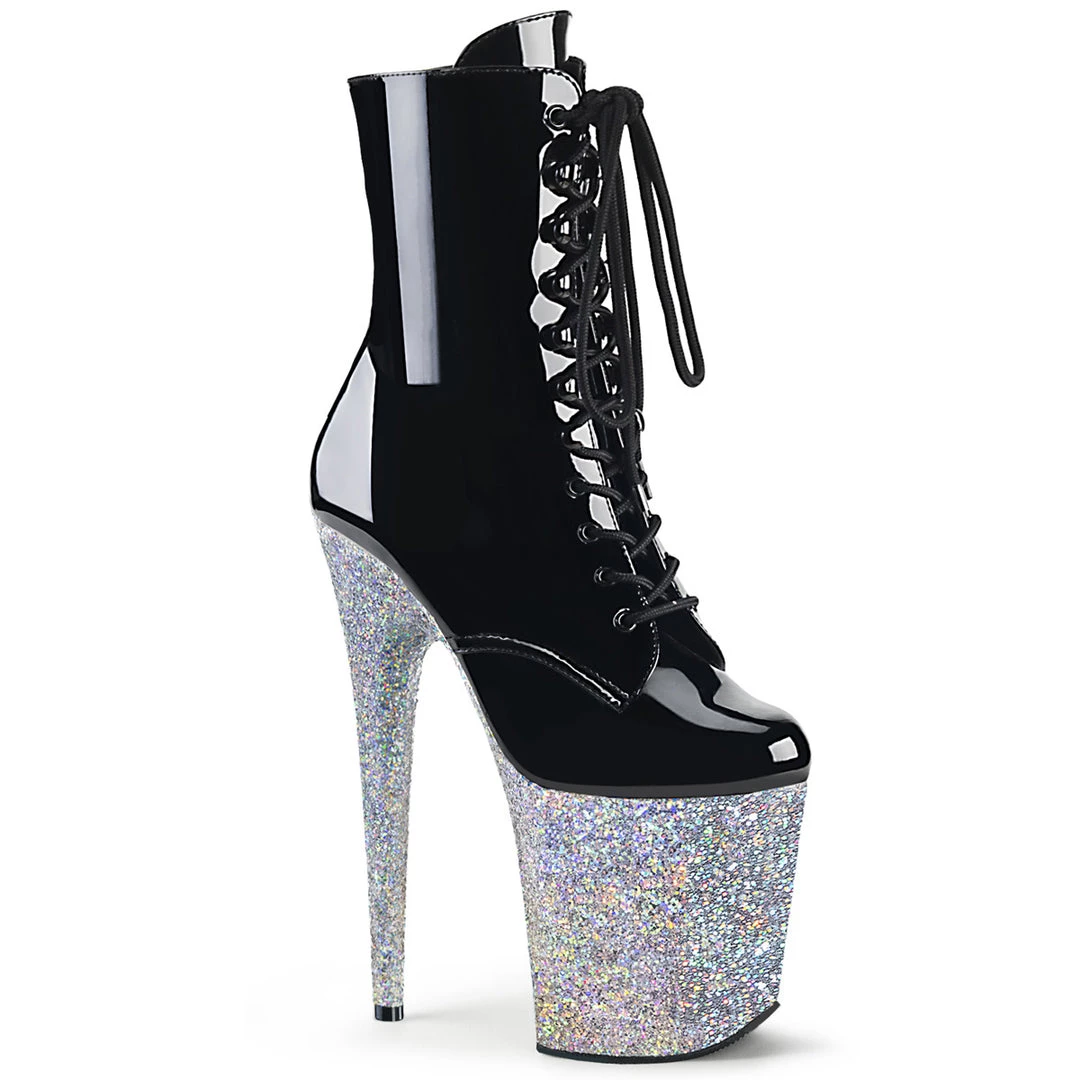 Eight inch platform Lace-Up Platform Ankle Boot with Full Inner Side Zipper. This glossy sexy black boot comes with a little twist. The platform is encrusted in multicolour glitter. They are perfect for pole dancing and a firm favourite with exotic dancers. Â
