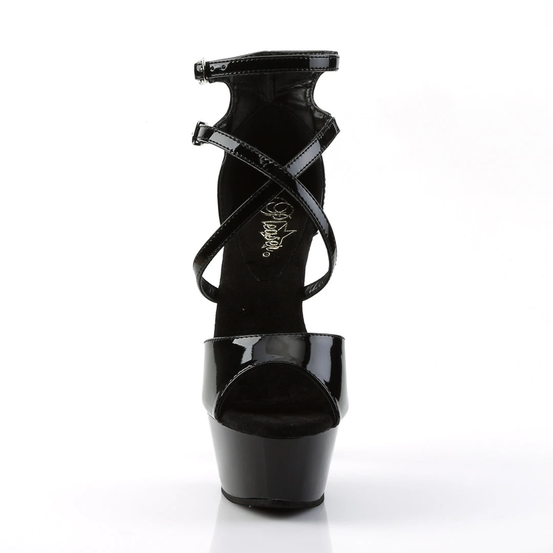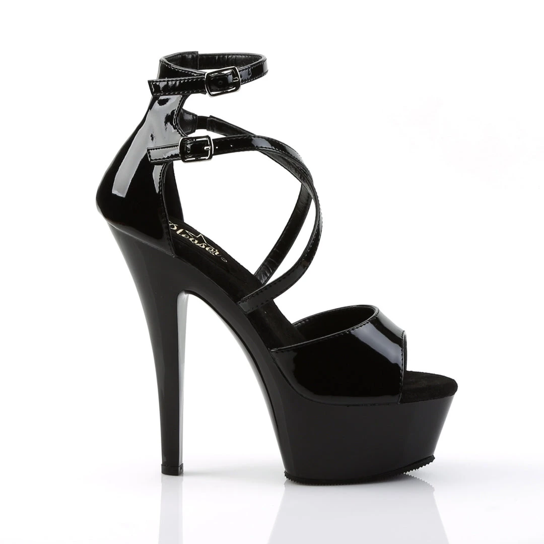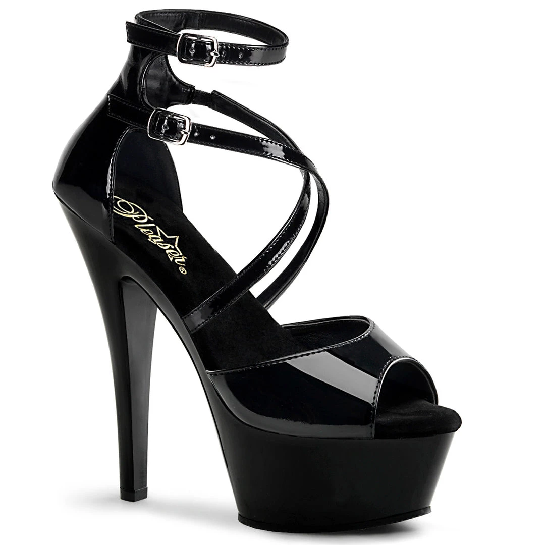 Another twist on a classic with this sassy Kiss sandal from Pleaser. The glossy upper features criss-crossing straps and a buckle around the ankle for added support. It also features an ultra-high platform that puts this shoe over the top.