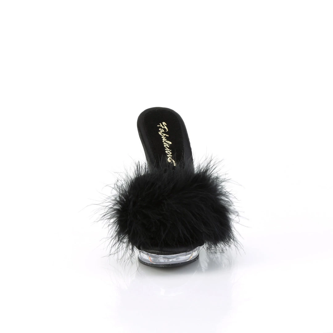 Sassy black mules with wide toe strap, soft black cushioning and 5 inch (12.5 cm) clear high heels. The front-heel difference is reduced by a chic 0.75 inch (2 cm) clear platform which adds stability and looks. However, the main attraction in these mules is the marabou embellishment attached on the toe strap. Fluffy and mysterious, these mules can be your favourite companion for long, hot nights.Â