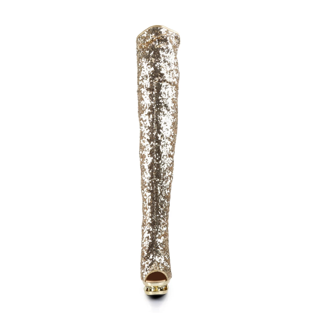 Elegant thigh-high boots in gold sequin with full zip on the inner side for an easy put on and open toe for a chic look. The design is complemented by a sexy 6 inch (15 cm) high stiletto heel and the front double platform with glossy look and rhinestone embellishment in between the two platform layers. Sparkling and leg flattering, these boots make a statement whenever worn!Â