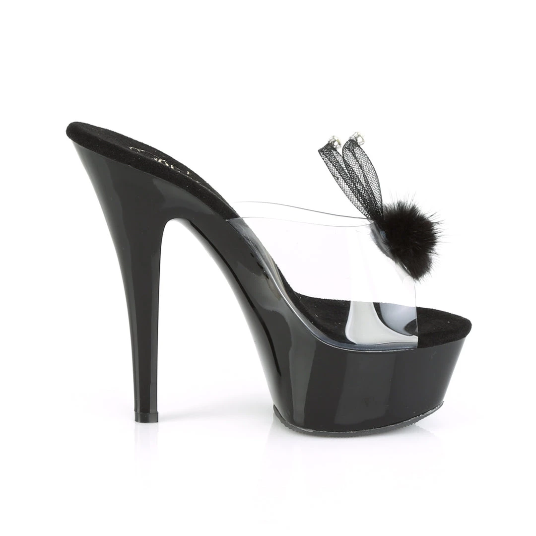 Hop to it in these super sexy bunny platform sandals with ankle strap and black vegan leather cushion insole. The 6 inch (15 cm) high stiletto heels and the matching front platform provide good grip and durability. The perfect pole dancing platform heel!Â