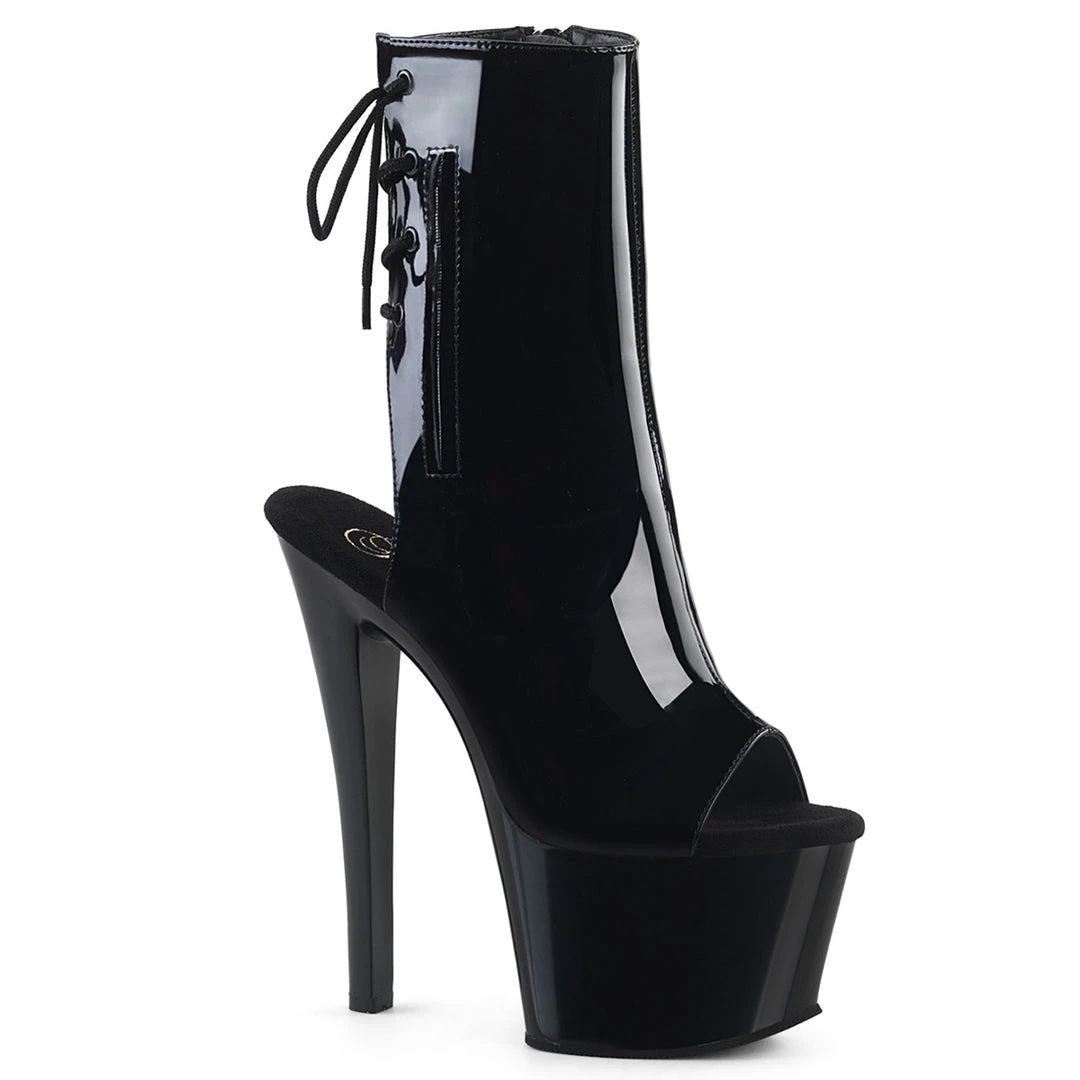 Sexy and sleek seven inch pole dancing platforms from Pleaser Shoes. These black patent and peep toe boots are comfortable, flattering and perfect for pole. They are versatile and can be worn from day to night.Â