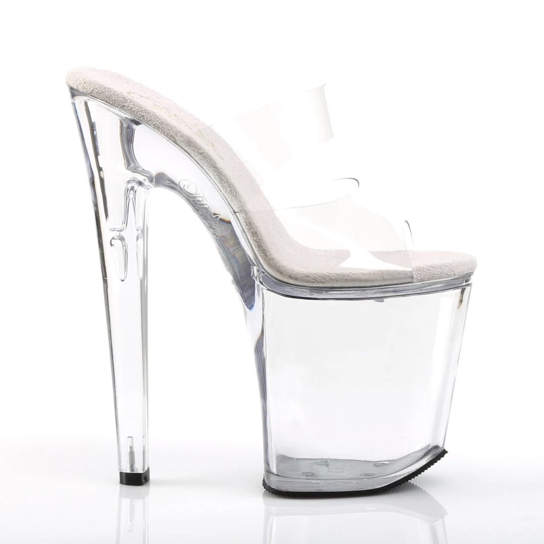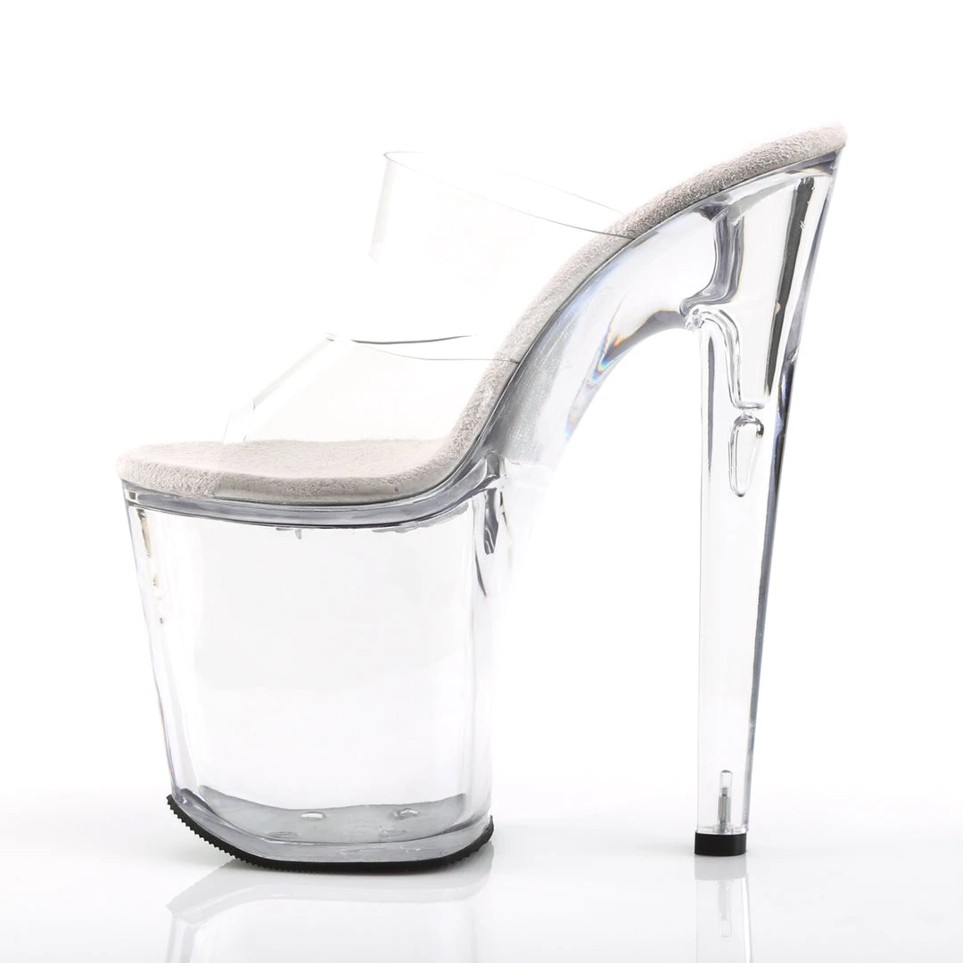 Clear seven inch sexy high heels featuring a sexy double strap across the front of the foot. These pole dancing platforms are sky scrapers, with an 8 inch heel making them not for the faint-hearted!