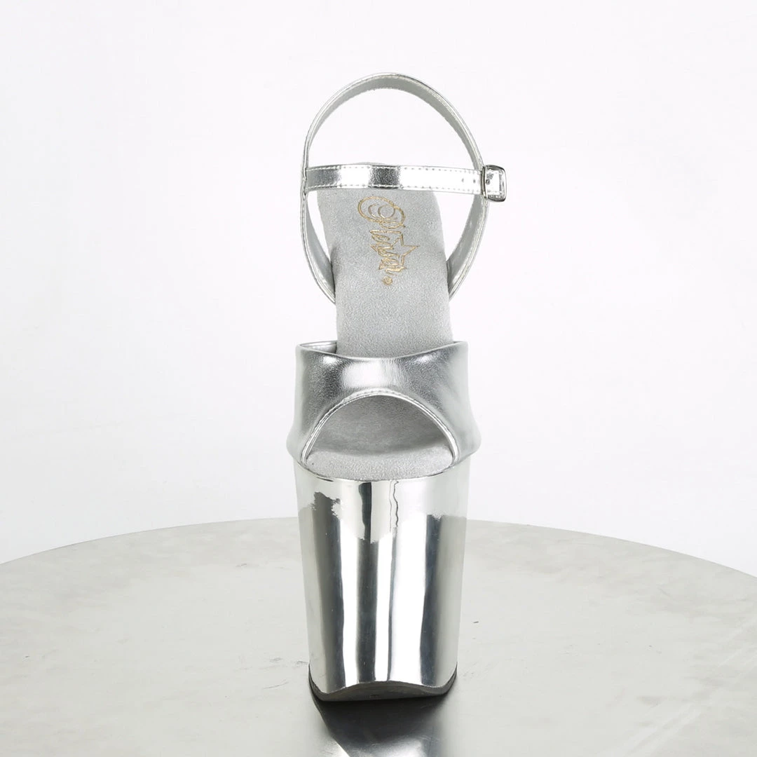 These super sexy chrome 8 inch platform heels are perfect for pole dancing and performing. They come with a sexy twist, a fully encrusted glitter underside! The ankle strap keeps the foot securely in place and the open toe is extremely flattering.