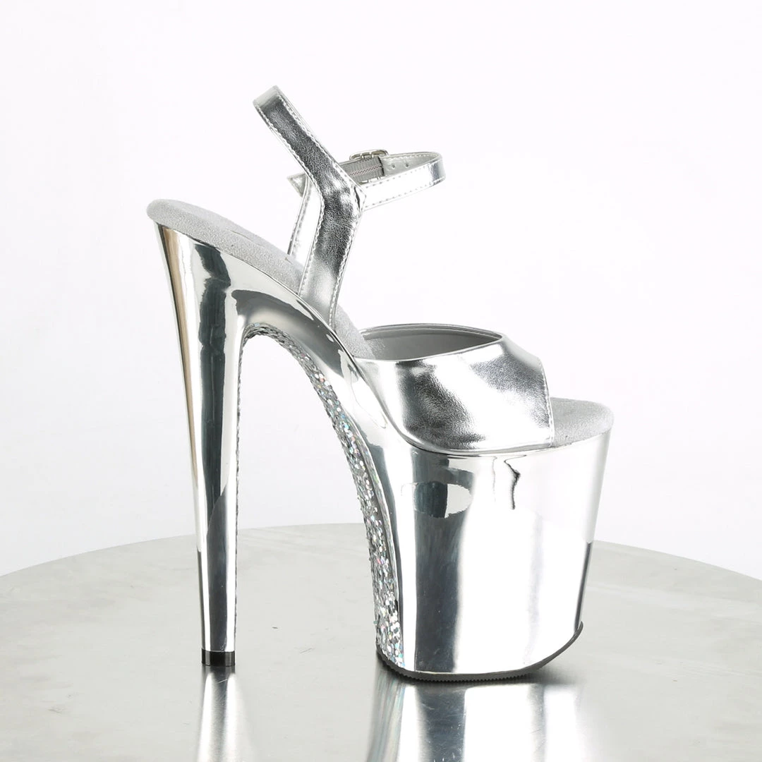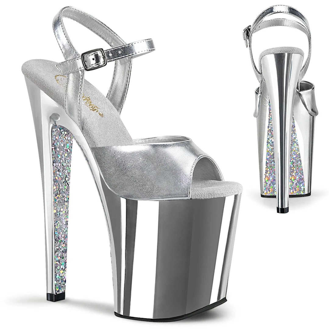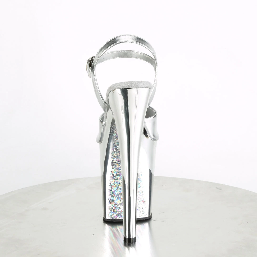 8 (200mm) Heel, 4 (100mm) Platform Ankle Strap Sandal Featuring Chrome Plated Platform w/ Slv Multi Glitter Platform Underside & Front of Heel